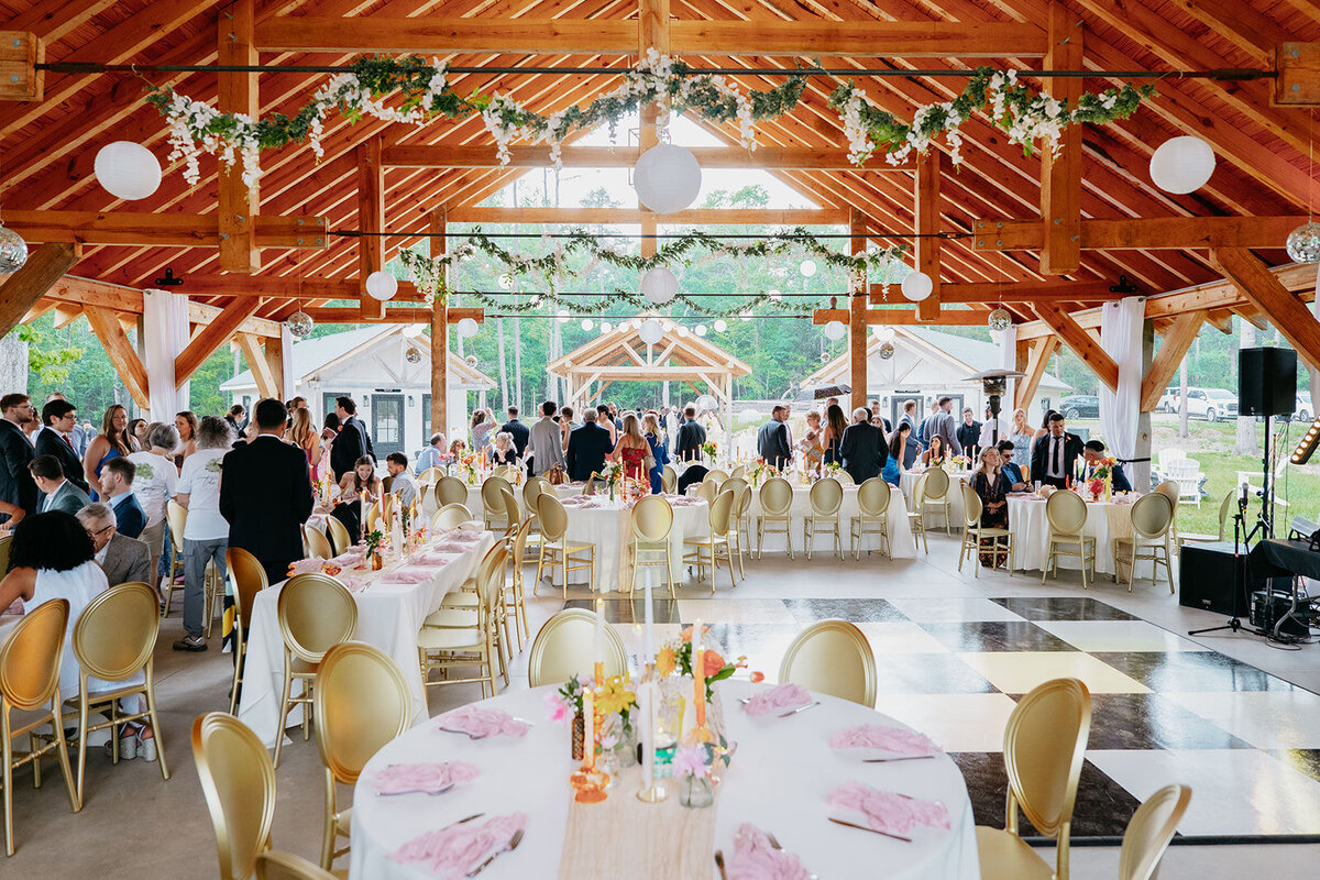 Our 2,400 sq. ft. open-air pavilion, crafted from wood milled right here on the property, holds the spirit of our land in every beam.